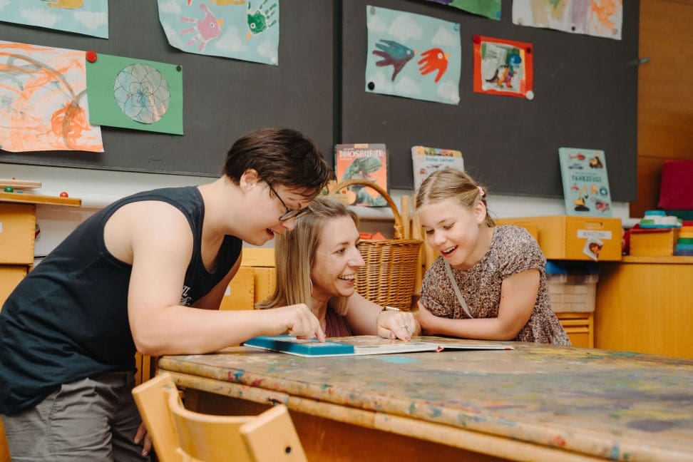 Lernmoment in der HPS: Kinder mit Betreuerin entdecken gemeinsam ein Buch im Unterricht.