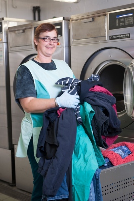 Wichtig für die Arbeit in der Wäscherei ist die Feinmotorik. Die Mitarbeitenden müssen auch einfache Wörter lesen und schreiben können sowie Zahlen bis 40 kennen. In der Wäscherei waschen Menschen mit Behinderung Frotteewäsche, Bettwäsche, Kleidung und Berufskleidung – sogar solche der Feuerwehr. Pro Monat sind es über 5500 kg Wäsche. Die Aufgaben in der Wäscherei sind vielfältig: Sortieren, Waschen, Trocknen, Bügeln, Mangeln, Falten und Instandhalten der Wäsche. Dazu nutzen wir umweltbewusste Verfahren. Zudem bietet die Wäscherei einen Hemdenwasch- und Bügelservice.